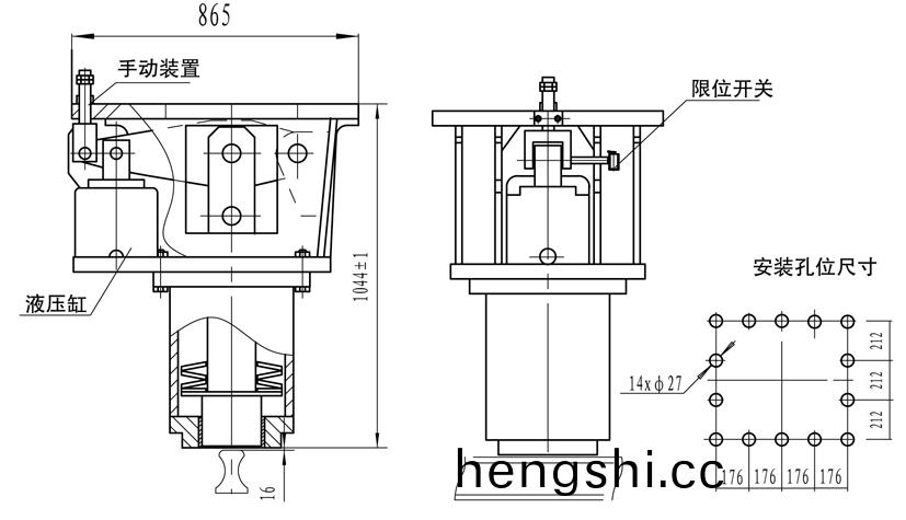 主(zhu)要(yao)設(she)計(ji)特(te)點(dian): 常(chang)閉(bi)式設計、採(cai)用液(ye)壓站(zhan)集中(zhong)驅動(dong)控(kong)製(zhi)以特製碟形(xing)彈(dan)簧(huang)實現(xian)頂(ding)軌(gui)製動(dong); 摩(mo)擦塊採(cai)用先(xian)進的高耐(nai)磨鋼,性能(neng)可(ke)靠; 設有(you)限(xian)位(wei)開(kai)關(guan),顯示(shi)工(gong)作狀態(tai); 帶手(shou)動釋放(fang),安(an)裝維護(hu)方便。