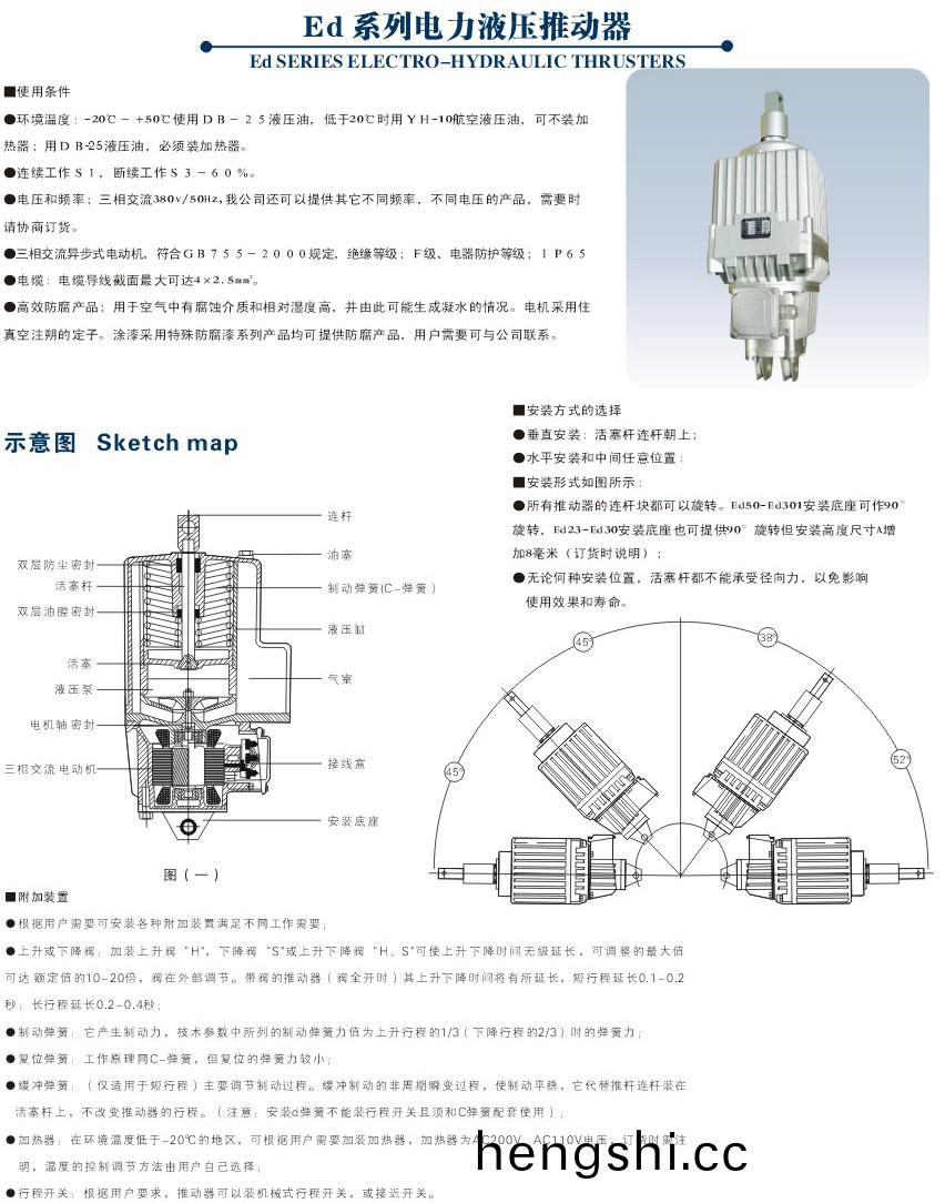 ED係(xi)列(lie)電(dian)力液(ye)壓(ya)推(tui)動(dong)器,適用于YWZ4,YWZ5,YWZ9等電力(li)液(ye)壓製動(dong)器的(de)工(gong)作驅(qu)動。